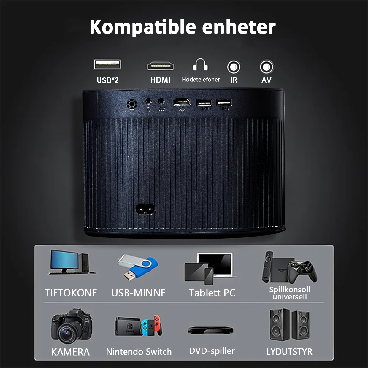 ApexHyper-projektoren støtter Bluetooth-tilkobling med smarttelefoner for trådløs projeksjon. Du kan også installere vår dedikerte app for selvstendig avspilling. For enheter som PS5 eller laptoper kobler du enkelt til via HDMI-kabel.